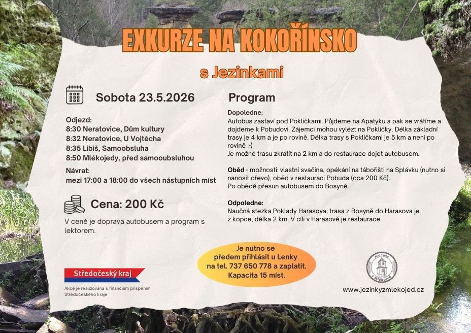 Pojedeme zájezdovým autobusem, nástupní místa budou v Neratovicích, zastávky Dům Kultury a U Vojtěcha, v Libiši U Samoobsluhy a v Mlékojedech před samoobsluhou.